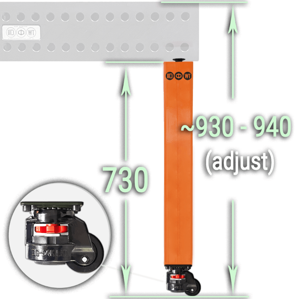 Pre-installed with heavy-duty castors featuring integrated levelling feet. Move your 1+ tonne table with ease, and use the levelling rubber winding insert mechanism to level/ground your table when necessary, with up to 20mm of adjustment.